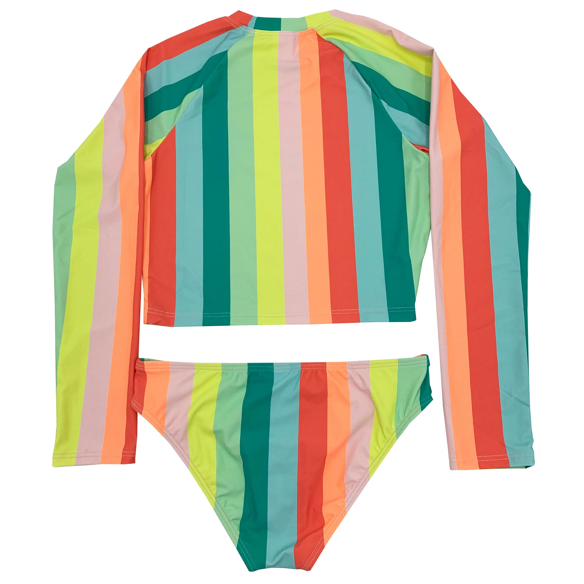 The Beach Lingo Girl’s Bleach Ball Crop Long Sleeve Rash Set will protect your girl while giving her the perfect beach look. This set includes a printed long-sleeved top and a bikini swim bottom made from a soft fabric with spandex for a comfy, flexible fit and features a bold stripe print for a colorful look. Your girl will love the Beach Lingo Girl’s Bleach Ball Crop Long Sleeve Rash Set!