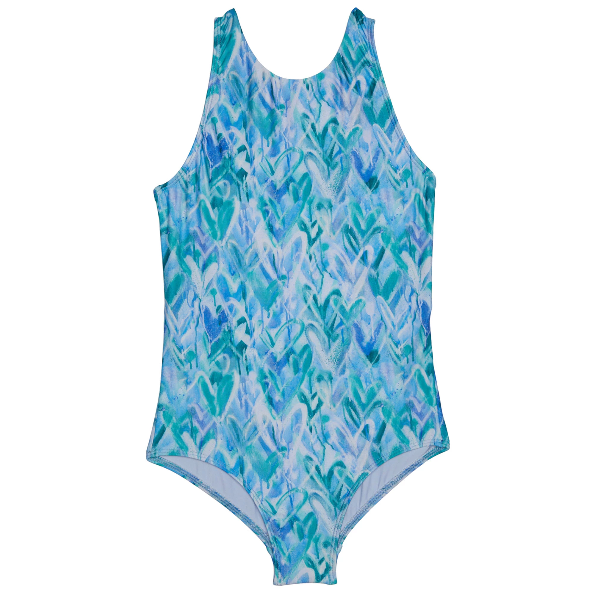 The Splendid Girls’ Graffiti High Neck One Piece Swimsuit is featured in the Graffiti Heart print collection. This one piece has open keyhole back detail with a cute, adjustable tie around the neck. The higher neckline offers extra sun protection on the chest.
