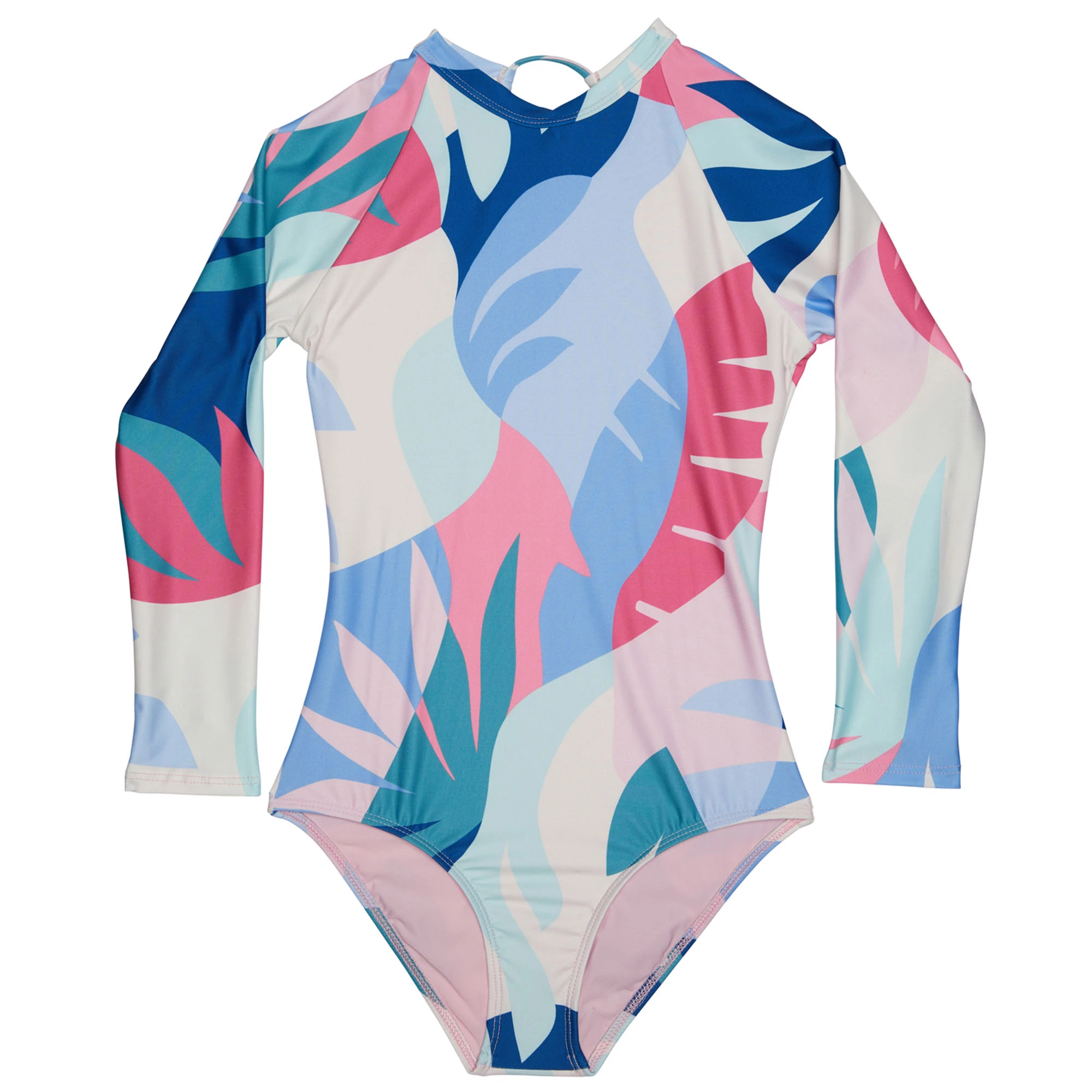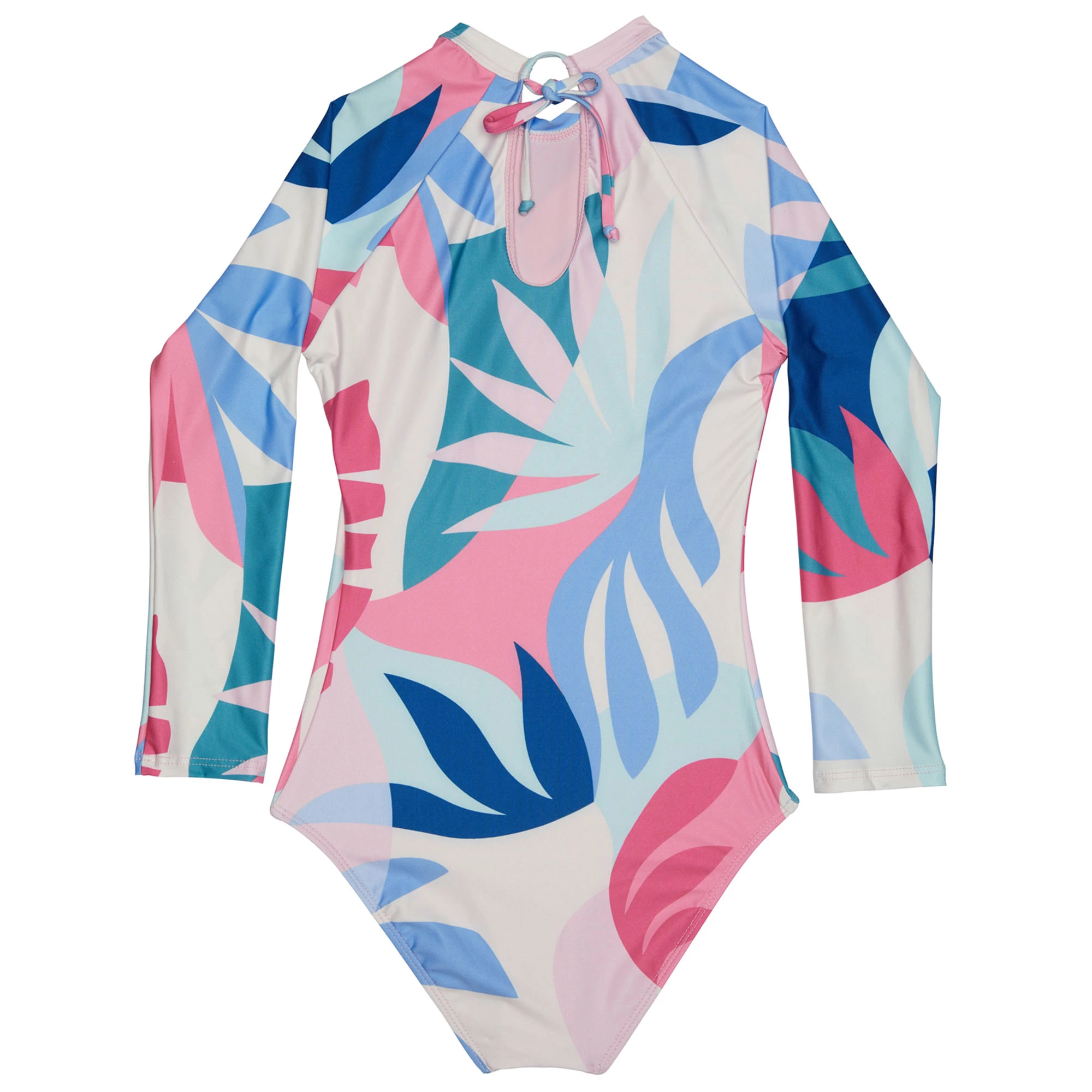 The Splendid Girl’s Mosaic Palm Long Sleeve Rashguard has an open keyhole back detail and long sleeves. The higher neckline offers extra sun protection on the chest.