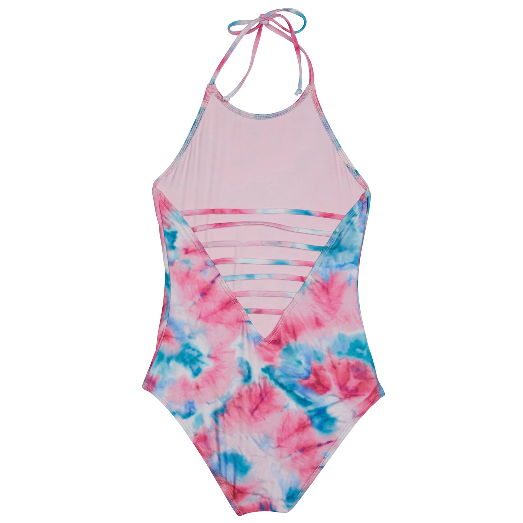 The Splendid Girls’ Twist of Fate One Piece Swimsuit features the Twist of Fate tie dye print. This one piece has a scoop back with ladder strap detail and adjustable necktie for customizing fit. The higher neckline offers extra sun protection on the chest and the seat coverage is modest.